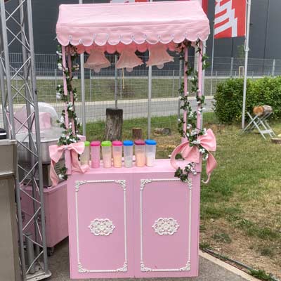 - Beschreibung: Verkaufsstand im Jahrmarktstil rosa. Das Dach ist beschmückt mit Stoff und weisser Kordel. Die Arbeitsfläche und die Seitenwände haben wir im Design rosa/weiss gefertigt. Unser Jahrmarkstand kann nur inkl. Transport, Auf- und Abbau von uns gebucht werden. Eine Betreuung kann durch den Veranstalter oder durch uns stattfinden.